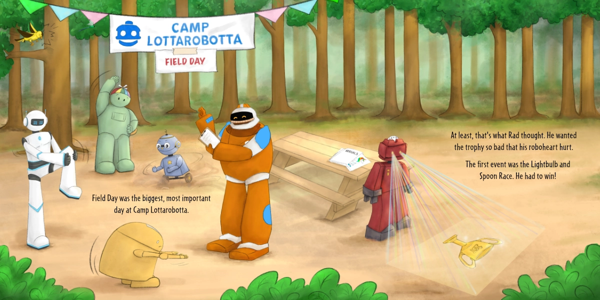 The Fight For First is a captivating children’s book that takes you on an exciting journey with Rad, a determined robot who wants nothing more than to win Field Day at Camp Lottarobotta. But as Rad becomes more and more focused on winning, he realizes that his quest for first place has taken a toll on his happiness and self-worth.