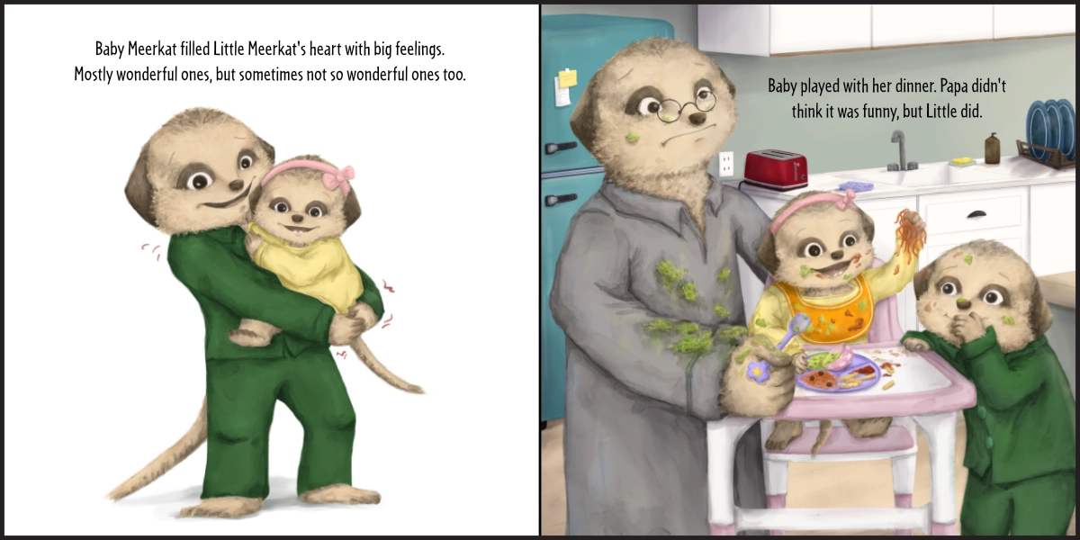 Little Meerkat has big feelings about his new baby sister. He loves playing with her and helping take care of her. But when Papa Meerkat’s attention shifts to caring for Baby, Little starts to feel worse and worse. Amazing Feelings follows his emotional journey through the ups and downs of life with a new sibling.
